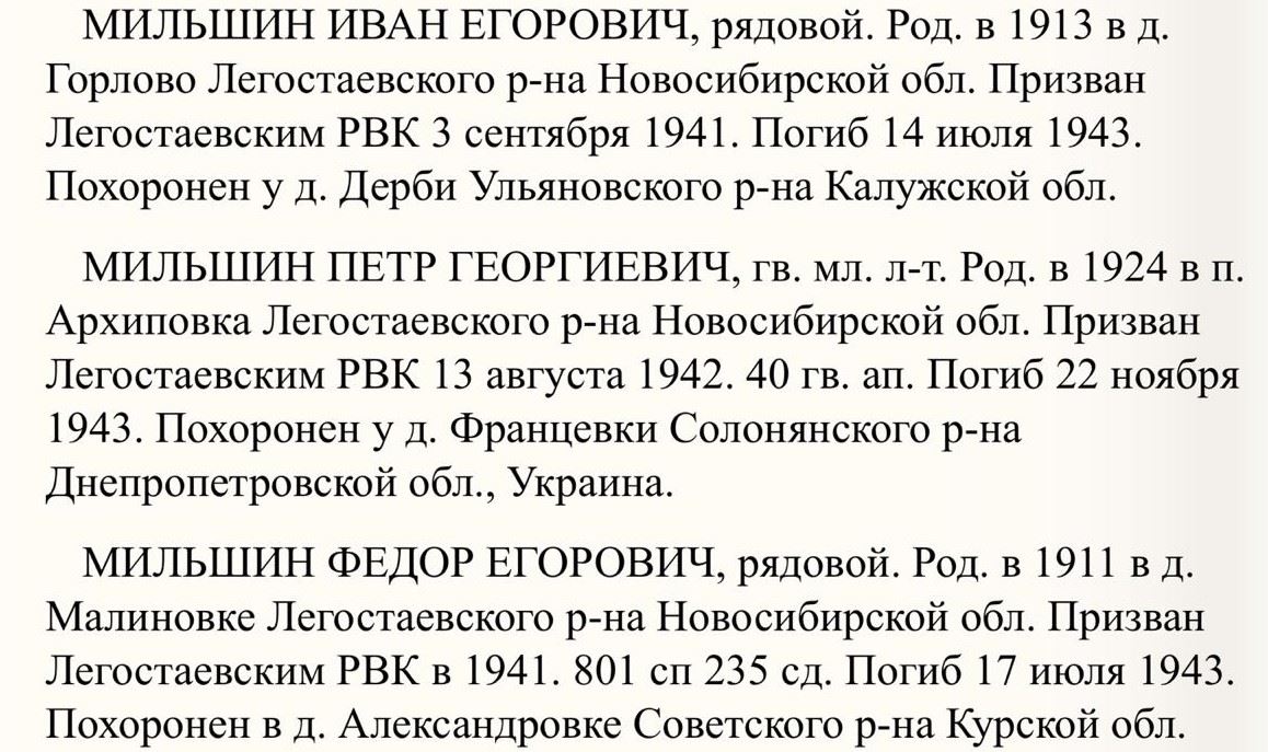 Младший брат Пётр Егорович Мильшин погибший в ноябре 1943 после форсирования Днепра