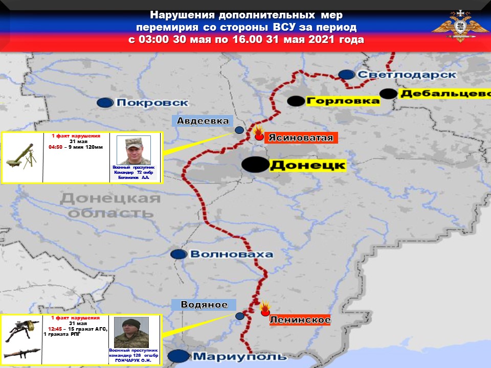 На мариупольском направлении боевики 128-й огшбр по приказу комбрига Гончарука с позиций в районе н. п. Водяное из АГС и РПГ обстреляли район н. п Ленинское, выпустив 16 гранат.