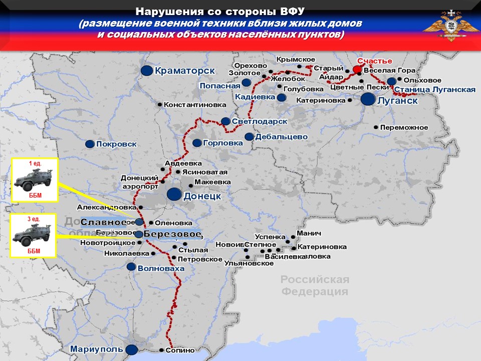 В нарушение третьего пункта дополнительных мер выявлено размещение трех бронированных боевых машин вблизи частных домостроений на западной окраине н. п. Березовое и одной бронированной боевой машины на ул. Космонавтов в н. п. Славное из состава 28-й омбр.