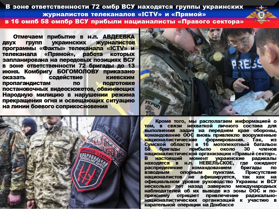 Отмечаем прибытие в н. п. Авдеевка двух групп украинских журналистов программы «Факты» телеканала ICTV и телеканала «Прямой», работа которых запланирована на передовых позициях ВСУ в зоне ответственности 72-й бригады до 13 июня.