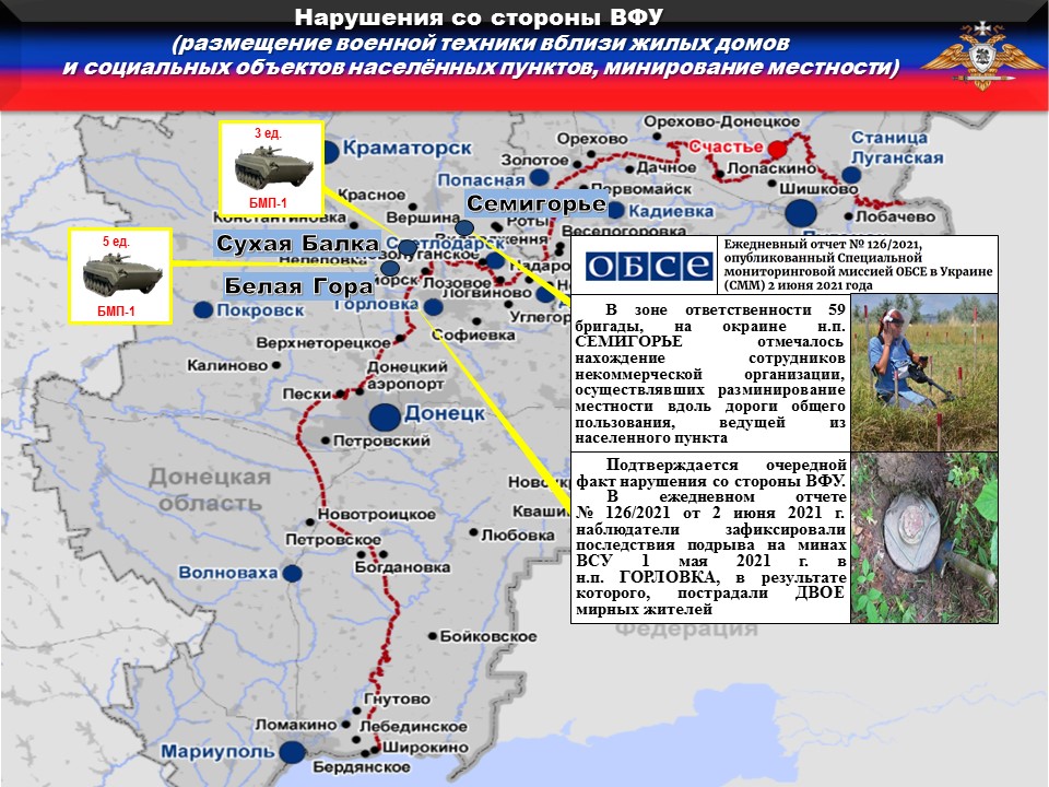 В нарушение третьего пункта дополнительных мер выявлено размещение в зоне ответственности 10-й огшбр ВСУ трех боевых машин пехоты БМП-1 вблизи частных домостроений н. п. Сухая Балка, а также пяти боевых машин пехоты БМП-1 в спальном районе н. п. Белая Гора.