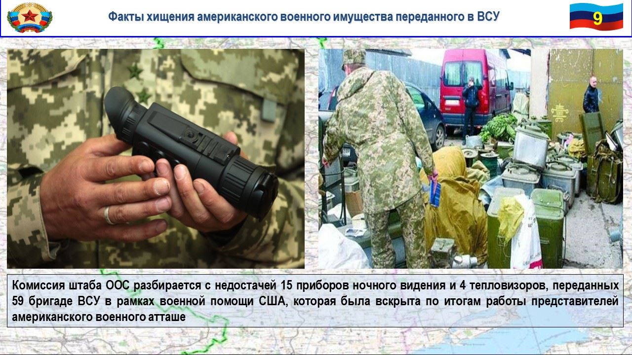 Так, комиссией штаба «ООС» проводится разбирательство по факту недостачи 15 приборов ночного видения и 4 тепловизоров, переданных 59 бригаде ВСУ в рамках военной помощи США.