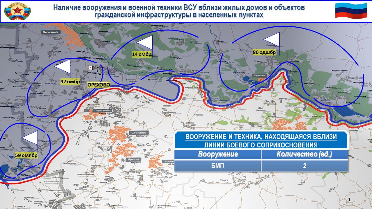 Так, за прошедшие сутки нашей разведкой выявлено размещение двух БМП в зоне ответственности 14 бригады в районе н. п. Орехово.