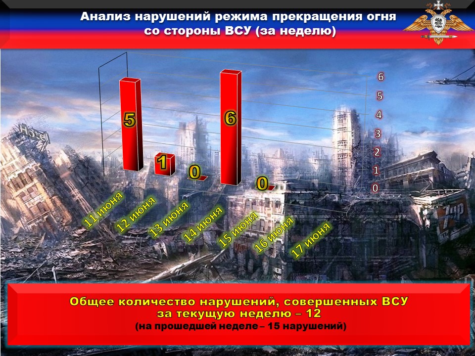 Факты нарушений в оперативном порядке доведены до представителей украинской стороны в СЦКК с целью своевременного принятия мер к нарушителям перемирия и исключения случаев фальсификации учетных данных о нарушениях режима прекращения огня со стороны украинских боевиков.