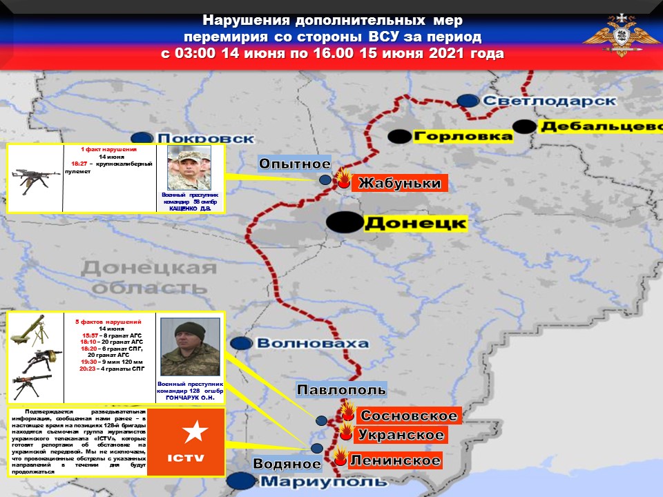 По имеющейся у нас информации от источника в штабе ОТГ «Восток», 14 июня в ходе следования к позициям представителей комплексной комиссии по контролю за соблюдением режима прекращения огня в районе н. п. Павлополь, двое военнослужащих 1-го батальона 128-й огшбр отклонились от установленного маршрута и подорвались на противопехотной мине.