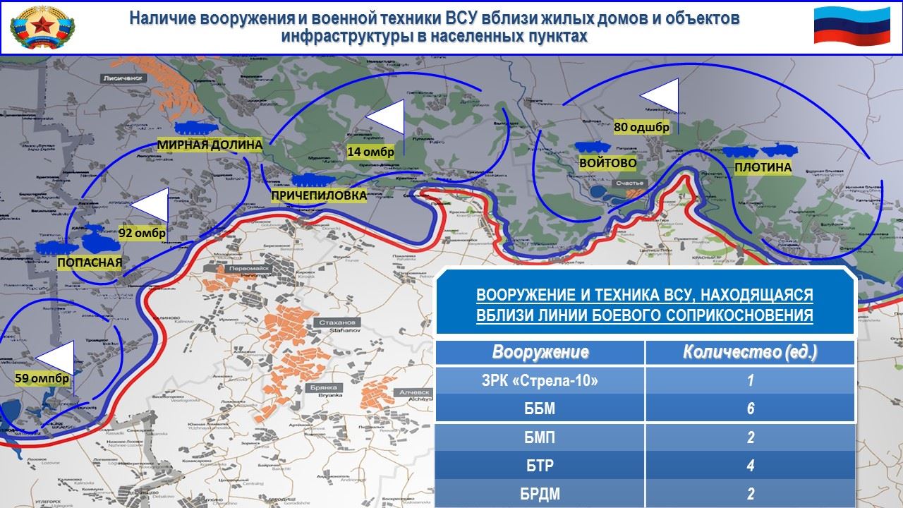 Кроме того, в зонах ответственности: 14 бригады — две боевые машины пехоты в н.п. Причепиловка; 80 бригады — три бронетранспортёра БТР-70 на территории жилого объекта в н.п. Войтово, две бронированные разведывательно-дозорные машины и бронетранспортёр БТР-70 вблизи жилых домов н.п. Плотина.