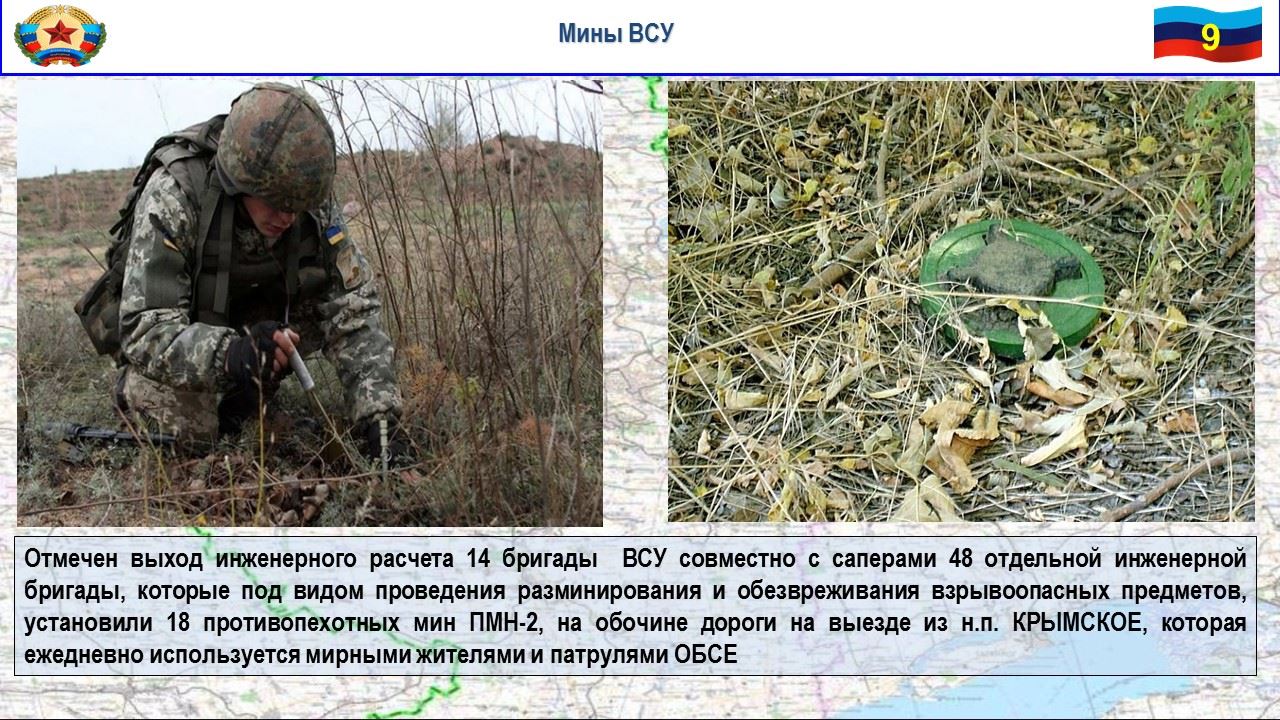 Так, нашей разведкой был отмечен выход инженерного расчета 14 бригады ВСУ совместно с саперами 48 отдельной инженерной бригады, которые под видом проведения разминирования и обезвреживания взрывоопасных предметов установили 18 противопехотных мин ПМН-2 на обочине дороги на выезде из н.п. Крымское, которая ежедневно используется мирными жителями и патрулями ОБСЕ.