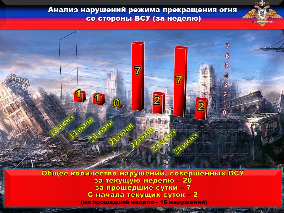 Так, за прошедшие сутки со стороны украинских боевиков зафиксировано семь нарушений второго пункта Комплекса дополнительных мер по контролю за соблюдением режима прекращения огня.