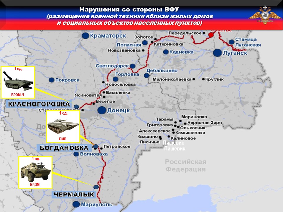 В нарушение третьего пункта дополнительных мер, выявлено размещение трех единиц вооружения и военной техники ВСУ вблизи жилых домов и муниципальных объектов на подконтрольной Украине территории.