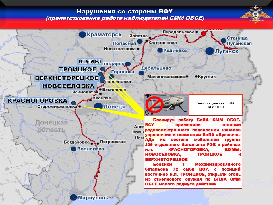 Так, с целью недопущения фиксации нарушений со стороны 28, 10 и 72-й бригады ВСУ, противник применил станции радиоэлектронного подавления каналов управления и навигации БПЛА «Буковель-АД» из состава мобильной группы 305-го отдельного батальона РЭБ в районах н. п. Красногоровка, Шумы и Новоселовка.