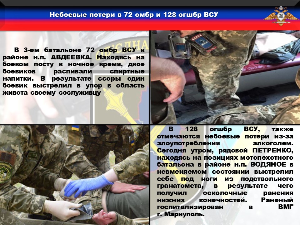В 128-й бригаде также отмечаются небоевые потери из-за злоупотребления алкоголем. Сегодня утром рядовой Петренко, находясь на позициях мотопехотного батальона в районе н. п. Водяное, в невменяемом состоянии выстрелил себе под ноги из подствольного гранатомета, в результате чего получил осколочные ранения нижних конечностей. Раненый госпитализирован в ВМГ г. Мариуполя.