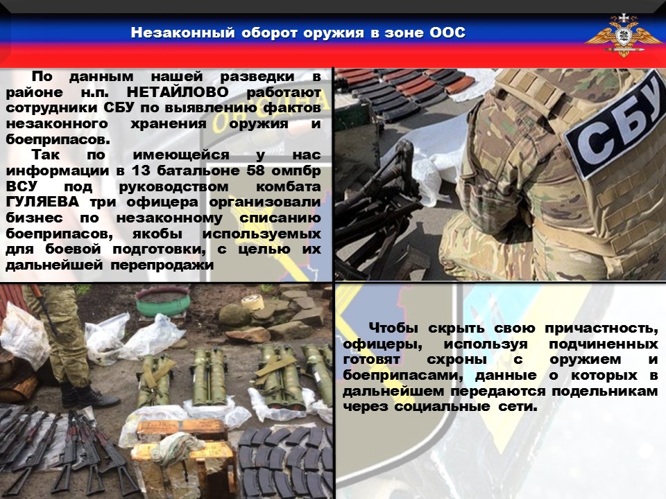 Так, по имеющейся у нас информации, в 13-м батальоне 58-й бригады под руководством комбата Гуляева три офицера организовали бизнес по незаконному списанию боеприпасов, якобы используемых для боевой подготовки, с целью их дальнейшей перепродажи.