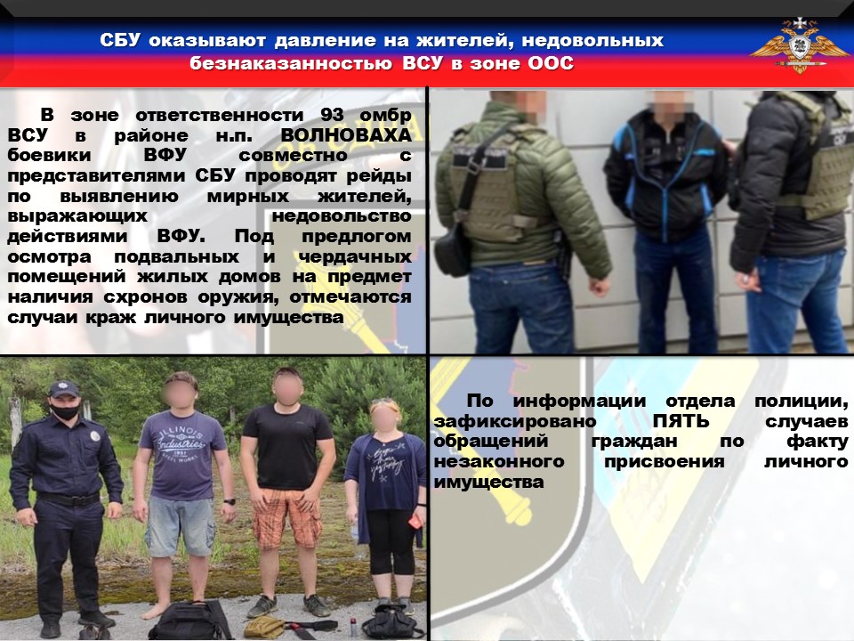 Так, по нашим данным, в зоне ответственности 93-й бригады в районе н. п. Волноваха боевики ВСУ совместно с представителями СБУ проводят рейды по выявлению мирных жителей, выражающих недовольство действиями ВСУ.