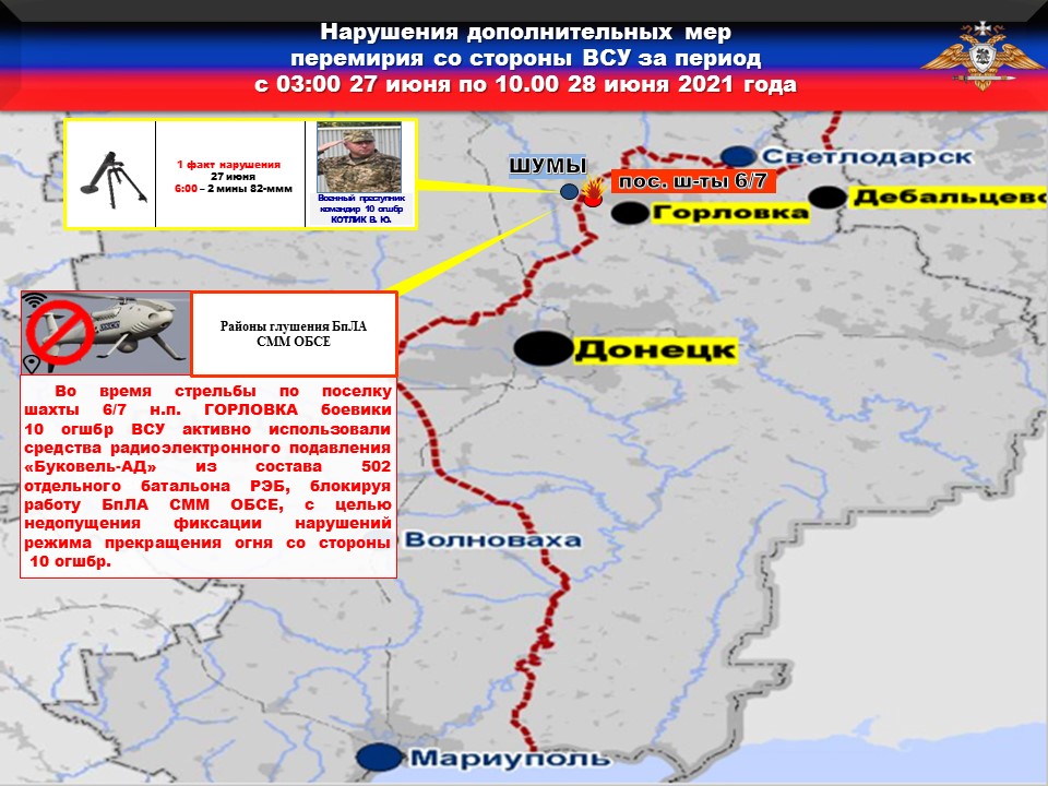 Во время стрельбы по населенному пункту отмечена работа средств радиоэлектронного подавления «Буковель-АД» из состава 502-го отдельного батальона РЭБ с целью блокирования БПЛА СММ ОБСЕ и недопущения фиксации обстрела окраин н. п. Горловка со стороны боевиков 10-й огшбр.