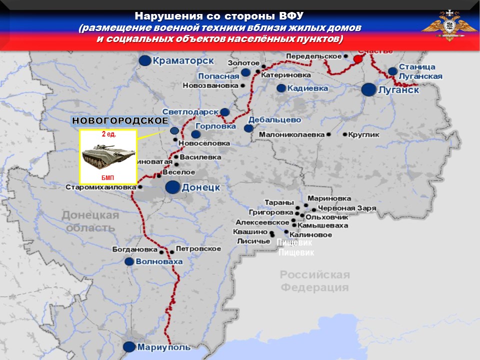 В нарушение третьего пункта дополнительных мер, выявлено размещение двух замаскированных боевых машин пехоты из состава 10-й огшбр ВСУ на ул. Береговой в н. п. Новгородское в непосредственной близости от жилых домостроений.