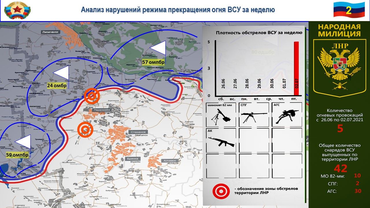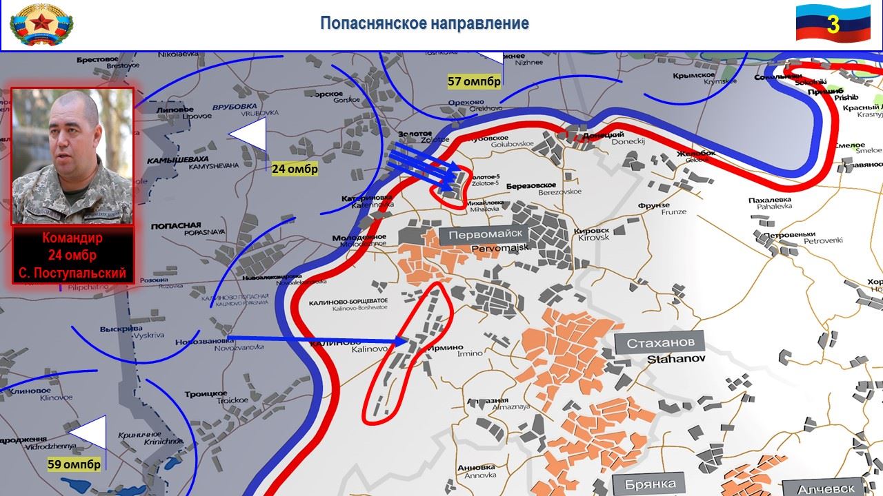 На попаснянском направлении боевики 24-й бригады ВСУ по приказу комбрига Поступальского, с позиций в районе н.п. Золотое-4 четыре раза открывали огонь из минометов калибра 82 мм, автоматического станкового гранатомета и стрелкового оружия по району район н.п. Золотое-5.