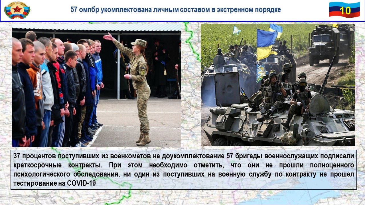 При этом необходимо отметить, что они не прошли полноценное психологическое обследование, ни один из поступивших на контракт не прошел тестирование на COVID-19. В результате преступной халатности украинского командования, в зону «ООС» направили 57 бригаду, в рядах которой находилось множество инфицированных солдат.