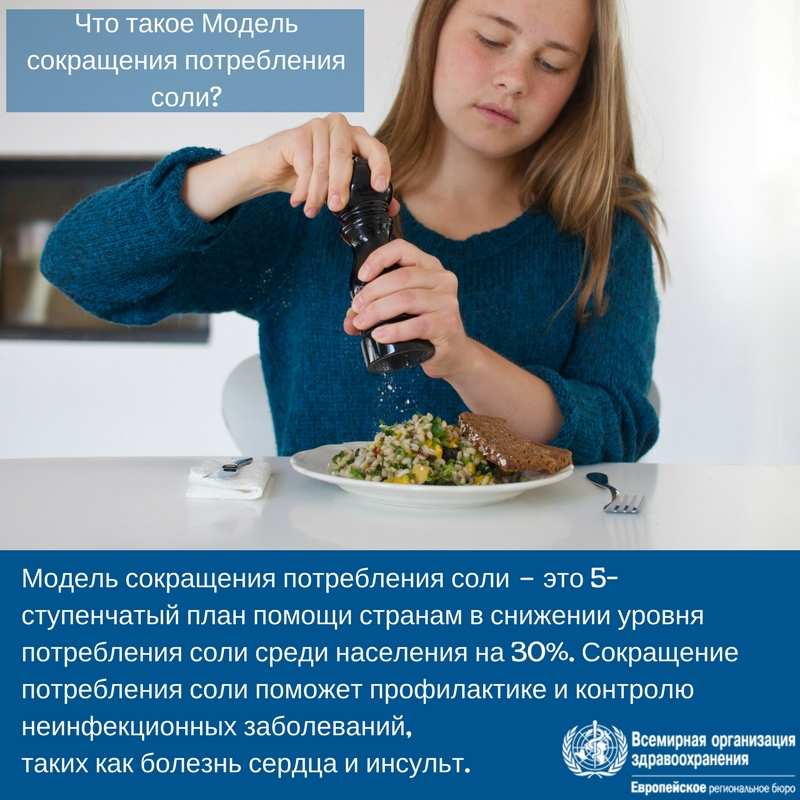Норма потребления соли в день — менее 5 г (это одна чайная ложка). При этом исследования Всемирной организации здравоохранения показывают, что уровень потребления соли в Европейском регионе колеблется между 8 г и 19 г в день. В основном избыточная соль попадает в организм из промышленной еды, производители которой всеми силами стараются сделать вкус продуктов ярче.