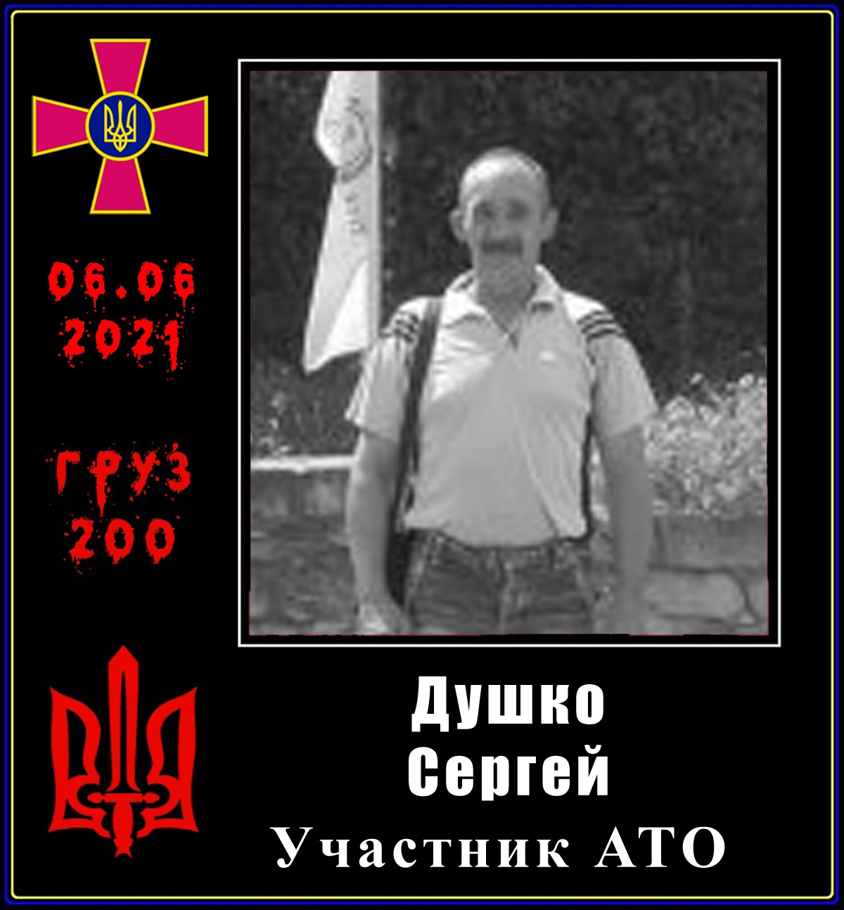 06.06.2021 — Душко Сергей, 1966 г. р., участник «АТО». Свою расплату за жизни невинно убиенных мирных жителей Донбасса получил в виде смерти полученной в результате внезапной остановки сердца. На родине «героя и защитника незалежной» в г. Луцке Волынской области остались жена, дети, внуки.