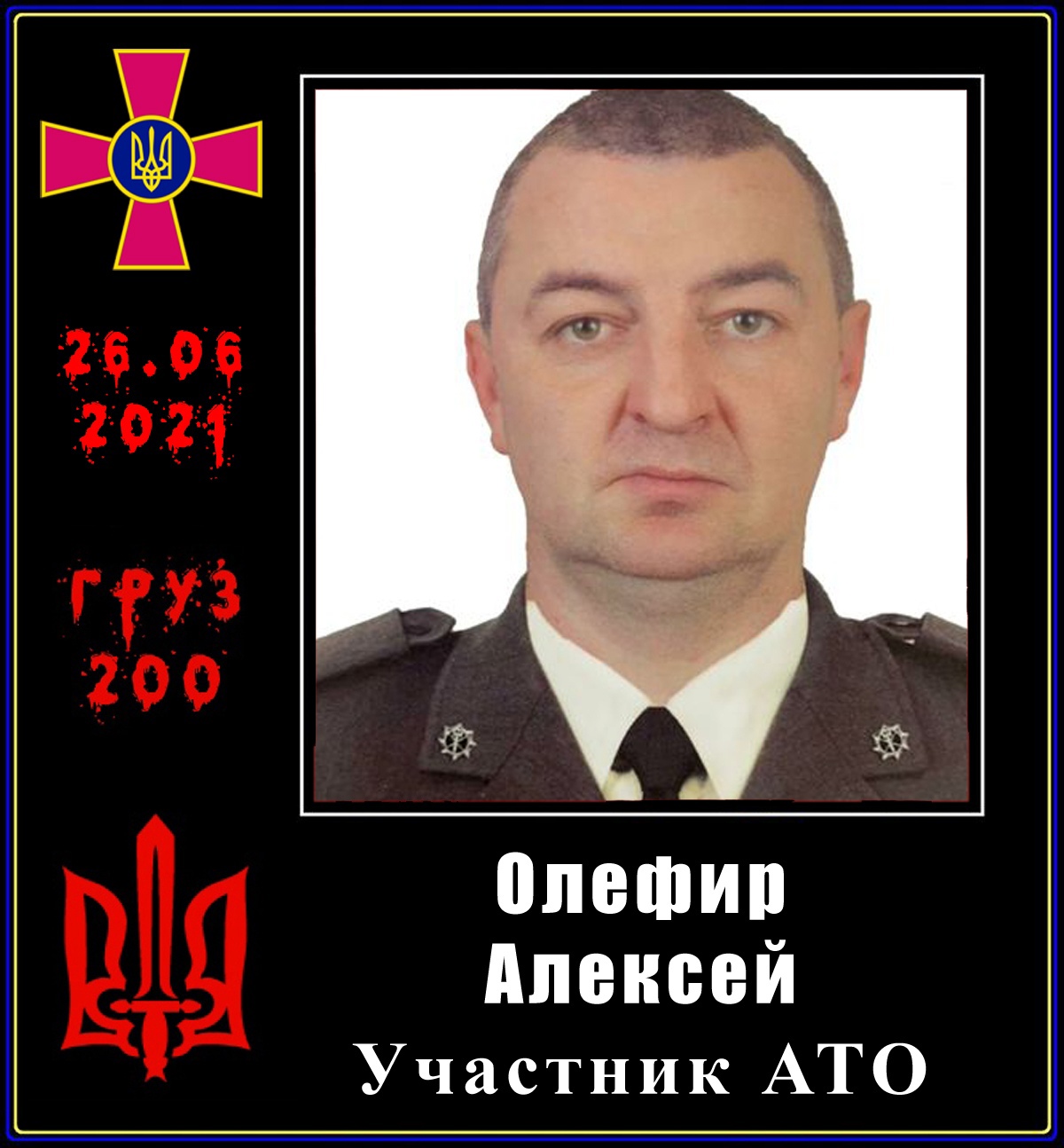 26.06.2021 — Олефир Алексей Васильевич, 1978 г. р., майор, начальник группы боевой и специальной подготовки восточного территориального управления военной службы правопорядка в ВС Украины. С марта 2014 года добровольно отправился в зону «АТО»/«ООС», где за деньги истреблял мирное население Донбасса.