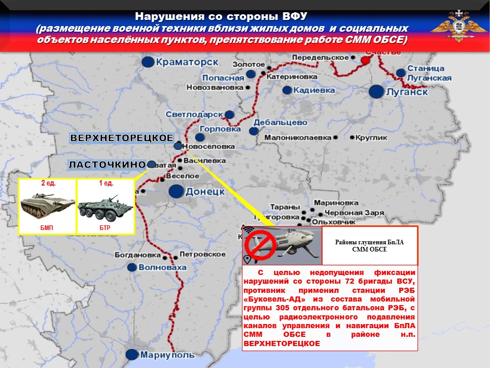 Так, с целью недопущения фиксации нарушений со стороны 72 бригады ВСУ противник применил станции РЭБ «Буковель-АД» из состава мобильной группы 305 отдельного батальона РЭБ с целью радиоэлектронного подавления каналов управления и навигации БпЛА СММ ОБСЕ в районе н. п. Верхнетрорецкое. Примечательно, что в указанном районе наблюдатели Миссии дважды пытались осуществить полет, но ввиду работы комплексов РЭБ противника осуществить мониторинг так и не удалось.