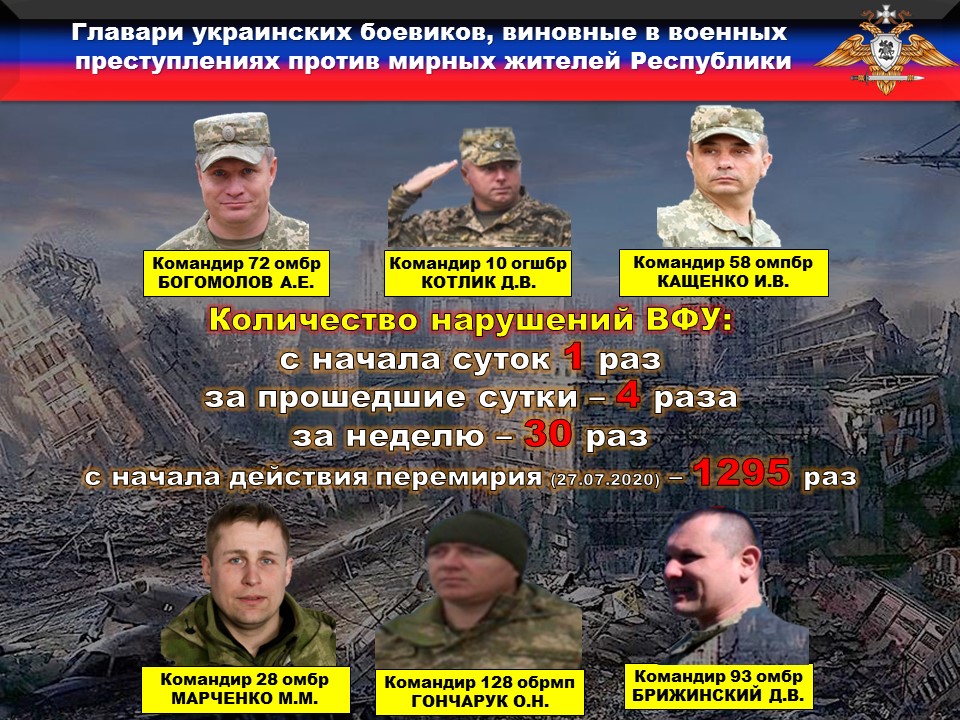 Всего за неделю зафиксировано тридцать нарушений режима прекращения огня со стороны украинских вооруженных формирований. Противник вел огонь по населённым пунктам Республики, применяя 120-мм минометы, ПТРК, различные типы гранатометов и стрелковое оружие.