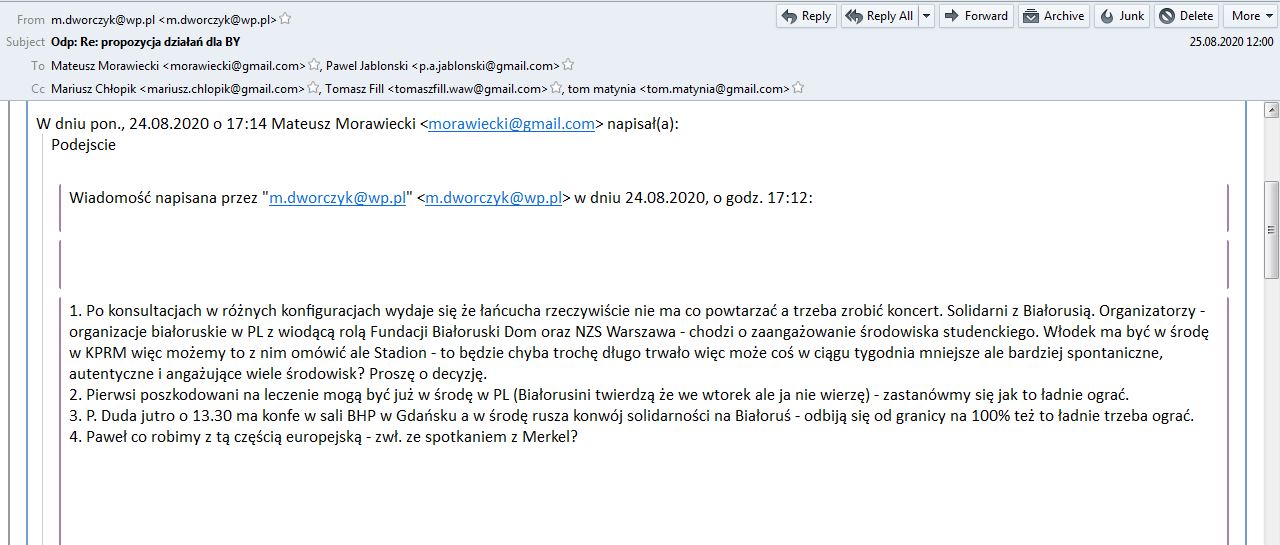 «1. Посоветовавшись в различных конфигурациях, кажется, что цепочку действительно нечего повторять, а надо сделать концерт „Солидарность с Белоруссией“. Организаторы — белорусские организации в РП при ведущей роли фонда „Белорусский дом“ и Независимого союза студентов Варшавы — речь идет о вовлечении студенческого сообщества.