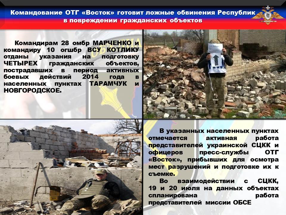 Нам стало известно, что командирам 28 бригады Марченко и командиру 10 бригады Котлику отданы указания на подготовку четырех гражданских объектов, пострадавших в период активных боевых действий 2014 года в населенных пунктах Тарамчук и Новгородское.