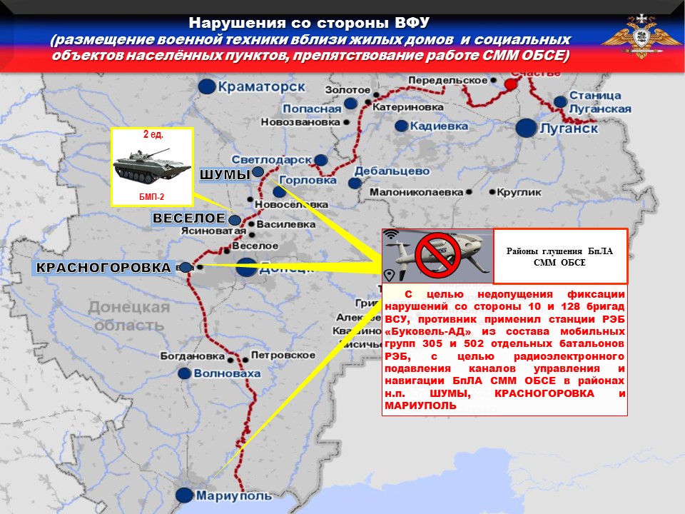 Так, с целью недопущения фиксации нарушений Комплекса дополнительных мер со стороны 10, 28 и 128-й бригад ВСУ противник применил станции РЭБ «Буковель-АД» из состава мобильных групп 305 и 502-го отдельных батальонов РЭБ с целью радиоэлектронного подавления каналов управления и навигации БпЛА СММ ОБСЕ в районах н. п. Шумы, Красногоровка и Мариуполь.