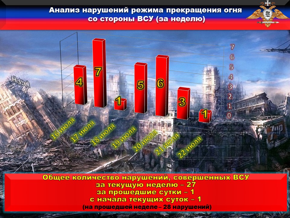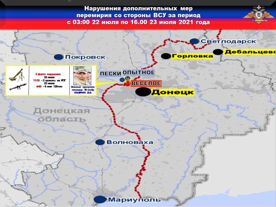 За неделю со стороны украинских вооруженных формирований зафиксировано 27 нарушений режима прекращения огня, из них 11 раз боевики под руководством военных преступников Котлика, Кащенко, Марченко и Гончарука применили крупнокалиберную артиллерию — 122-мм артиллерийские системы, 120-мм и 82-мм минометы, ПТРК.