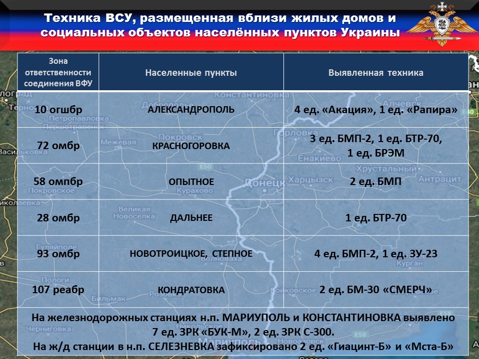 Кроме того, выявлено нахождение двух ЗРК С-300, расположенных на железнодорожной станции в н. п. Константиновка, а также две 152-мм буксируемые гаубицы «Гиацинт-Б» и «Мста-Б» на железнодорожной станции в н. п. Селезневка.