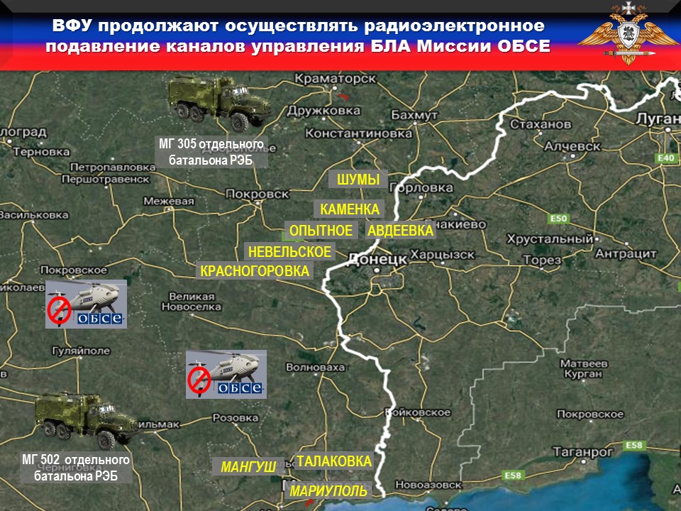 За неделю зафиксировано десять фактов подавления каналов управления и навигации БПЛА наблюдателей СММ ОБСЕ вдоль всей линии боевого соприкосновения в районах населенных пунктов: Шумы, Красногоровка, Невельское, Гнутово, Мариуполь, Мангуш, Авдеевка, Опытное, Каменка и Талаковка.