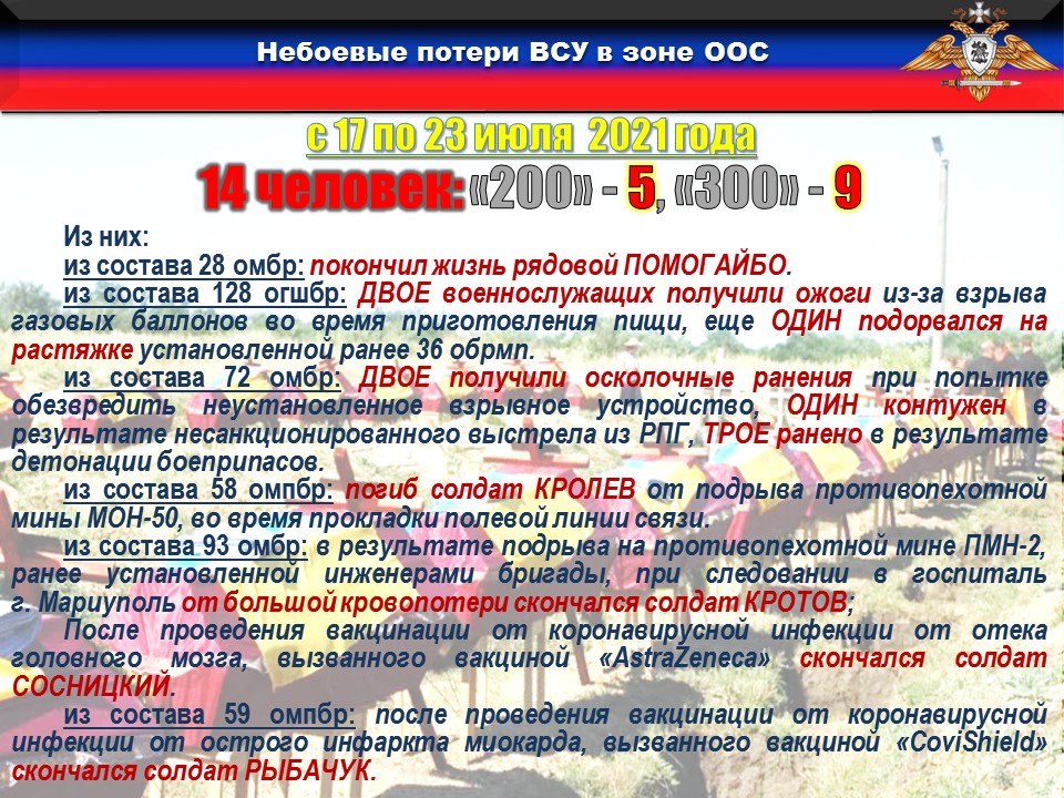 В период с 17 по 23 июля в соединениях и частях ОТГ «Восток» отмечались небоевые потери, которые составили 14 военнослужащих, из них пятеро погибло, девять получили ранения различной степени тяжести: