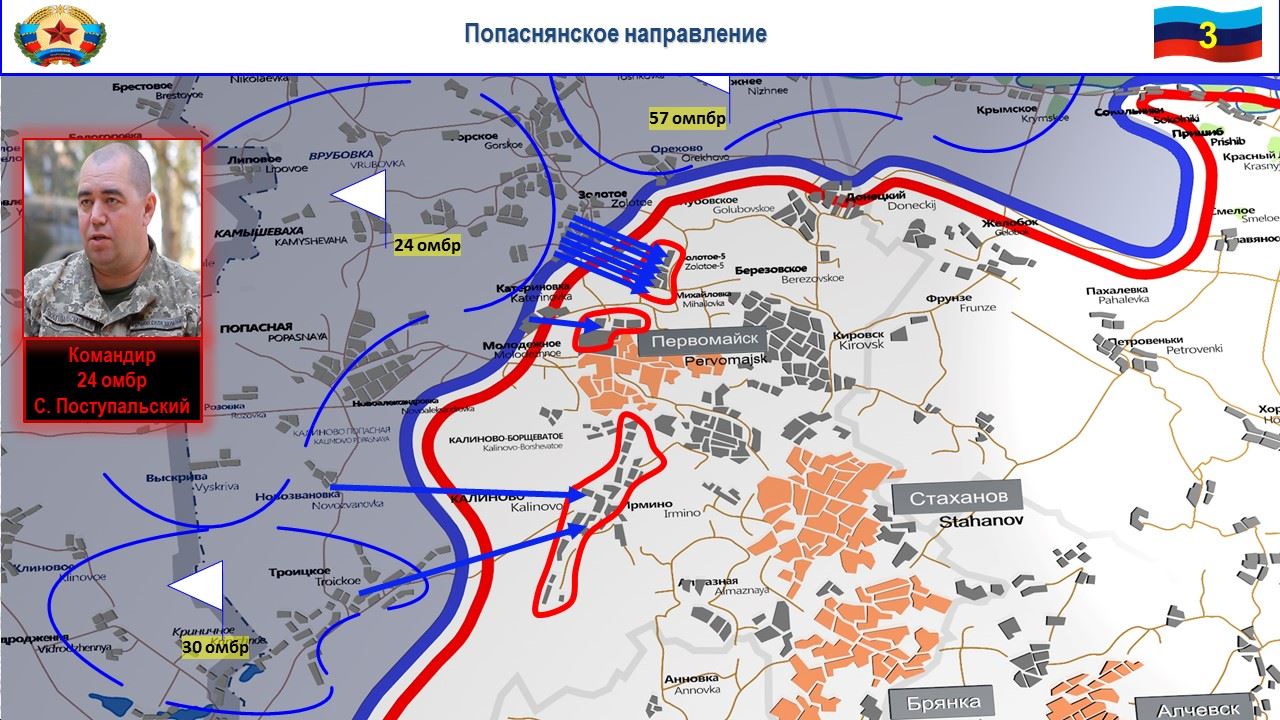 На попаснянском направлении боевики 3 батальона 24 омбр, выполняя преступный приказ Поступальского, с позиций в районе н. п. Золотое-4 шесть раз обстреляли из гранатометов, крупнокалиберных пулеметов и стрелкового оружия район н. п. Золотое-5, а также с позиций в районе н. п. Новозвановка и Троицкое из гранатометов и крупнокалиберных пулеметов обстреливали район н. п. Калиново.