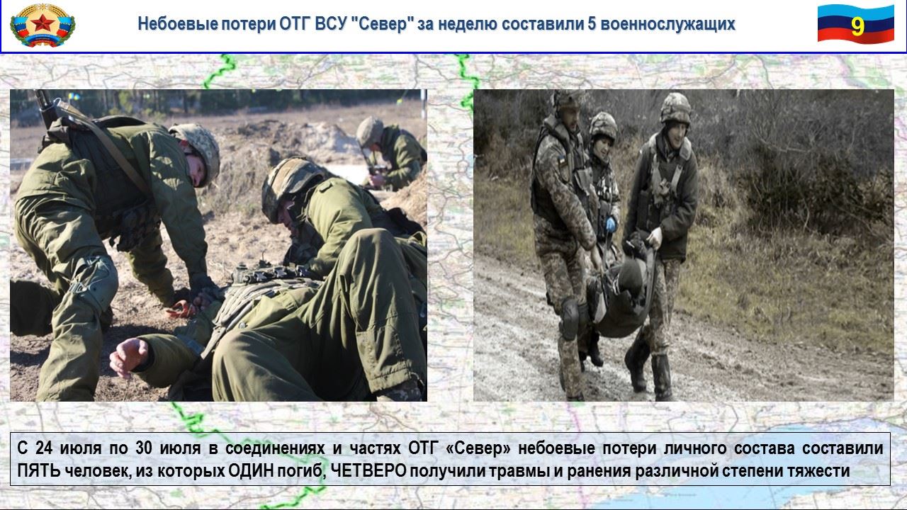 По данным нашей разведки, с 24 июля по 30 июля в соединениях и частях ОТГ «Север» небоевые потери личного состава составили пять человек, из которых один погиб, четверо получили травмы и ранения различной степени тяжести: