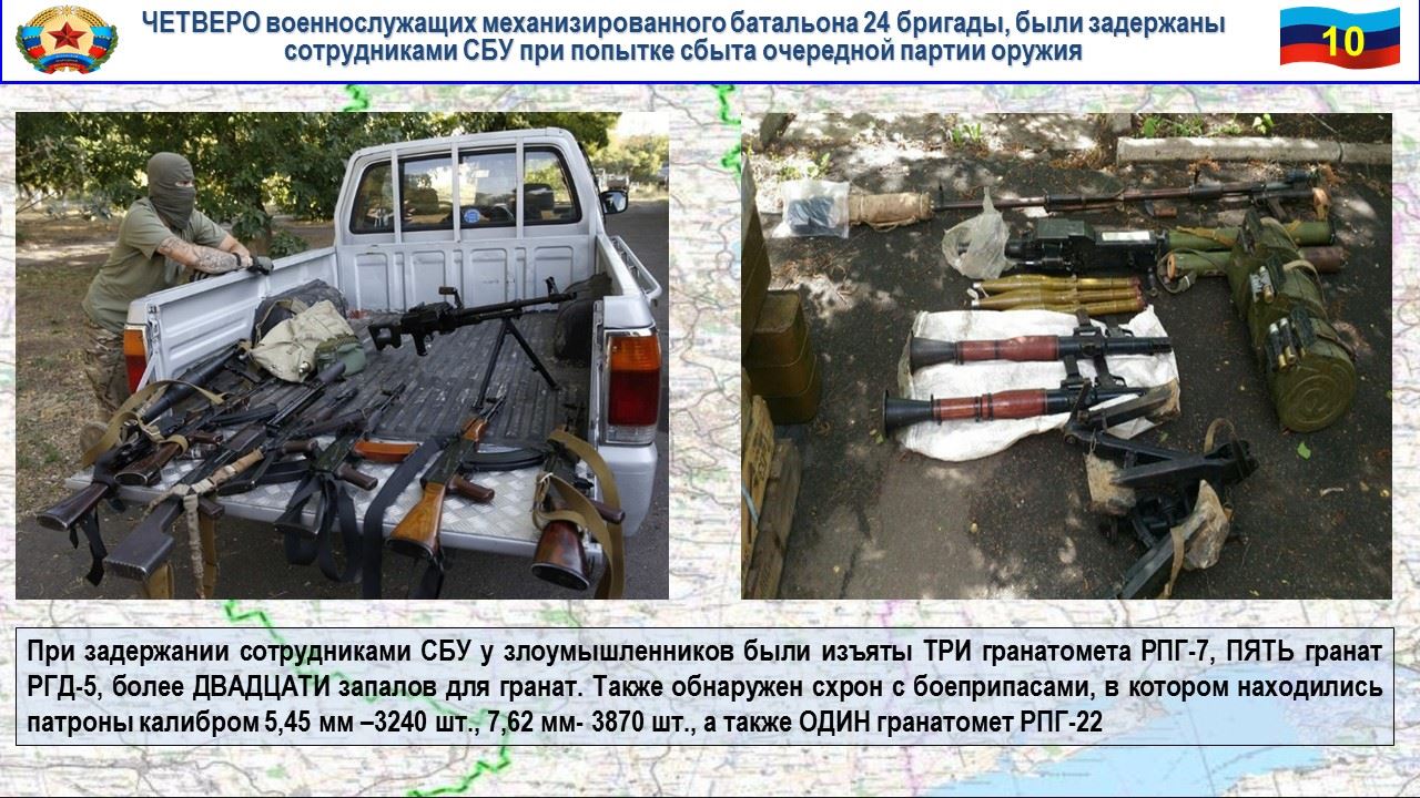 Так, четверо военнослужащих механизированного батальона 24 бригады были задержаны сотрудниками СБУ при попытке сбыта очередной партии оружия в н. п. Попасная.