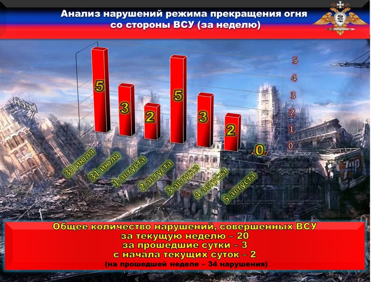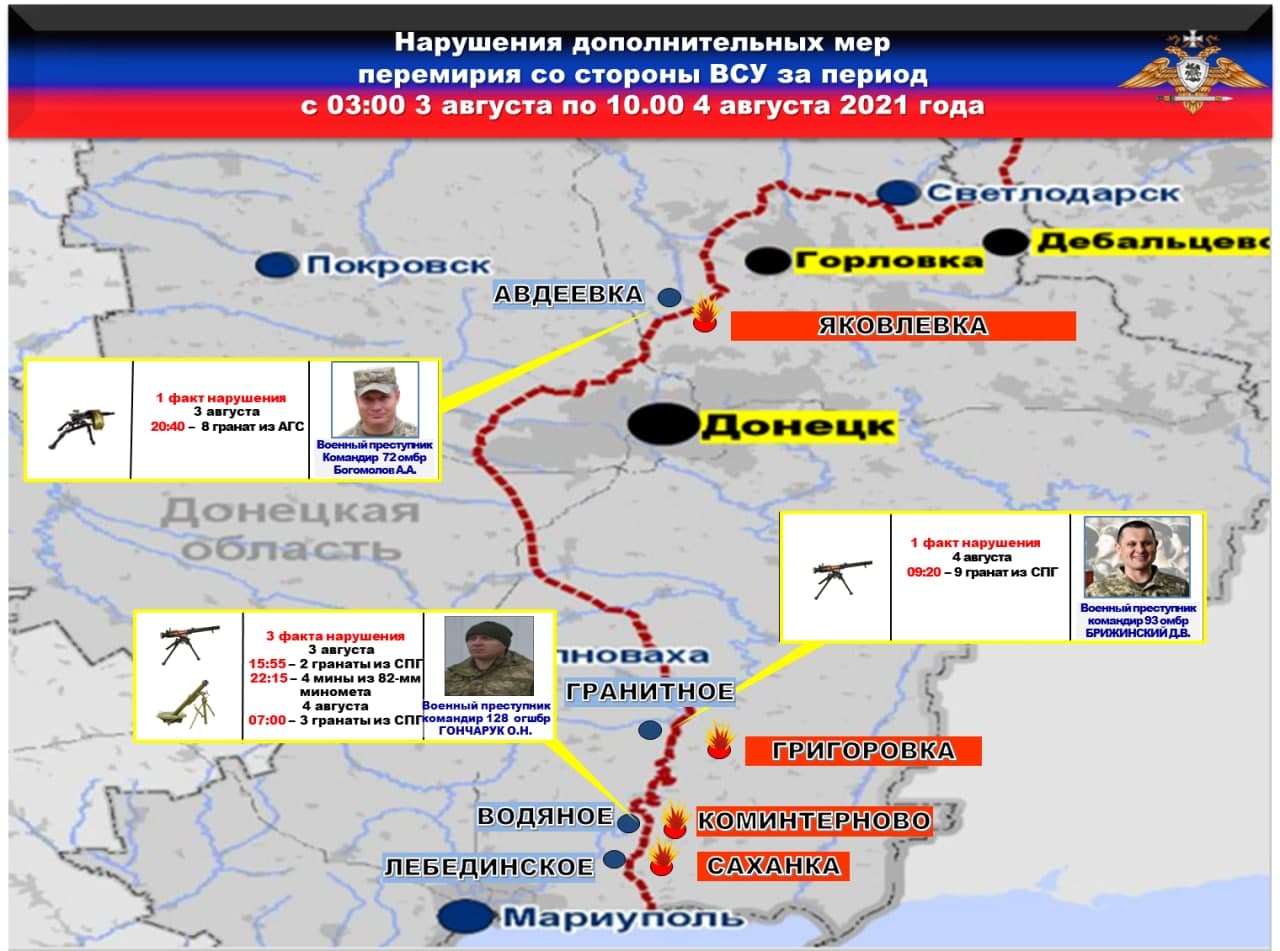 Факты нарушений в оперативном порядке доведены до представителей украинской стороны в СЦКК с целью своевременного принятия мер к нарушителям перемирия и исключения фальсификации данных о нарушениях режима прекращения огня со стороны украинских боевиков.