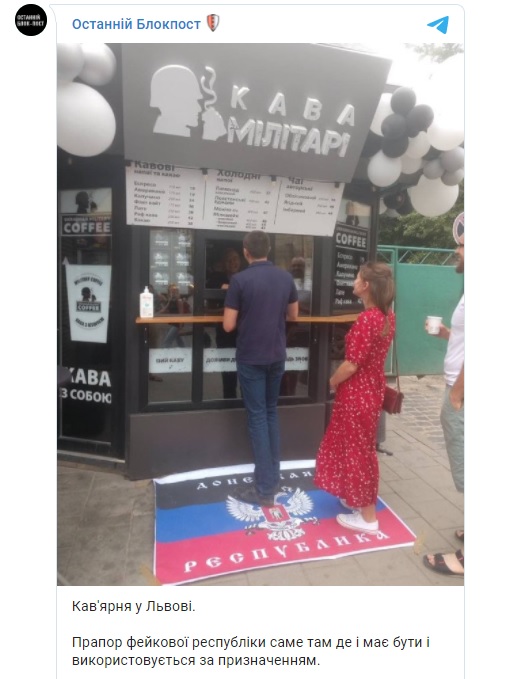 «Кофейня во Львове. Флаг фейковой республики именно там, где и должен быть, и используется по назначению», — подписан кадр из Львова.