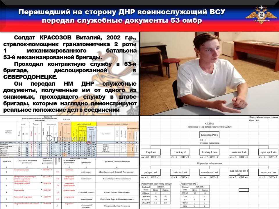 Напомню, на прошлой неделе солдат Виталий Красозов, 2002 года рождения, стрелок — помощник гранатометчика 2-й роты 1-го механизированного батальона 53-й механизированной бригады ВСУ добровольно перешел на территорию ДНР.