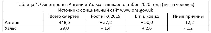 Такая же картина наблюдалась и в Великобритании. Хотя там жертв коронавируса на порядок больше, чем в Японии, и общая смертность в пандемию повысилась в разных регионах на 5-8%, но исключительно за счёт ковида (см. Таблицу 4).