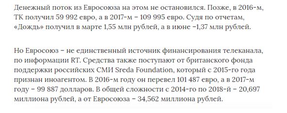 Очередная новость, подтверждающая мерзкую продажность либеральных СМИ. Телеканал «Дождь»*, признанный в России иноагентом, получил от Евросоюза более 130 тысяч евро, причем на основании официального договора об освещении отношений между ЕС и Россией. Хороших слов уже нет. Осталась только нецензурщина! Только представьте себе, что «дождевики» еще и возмущаются, что их признали иноагентами.