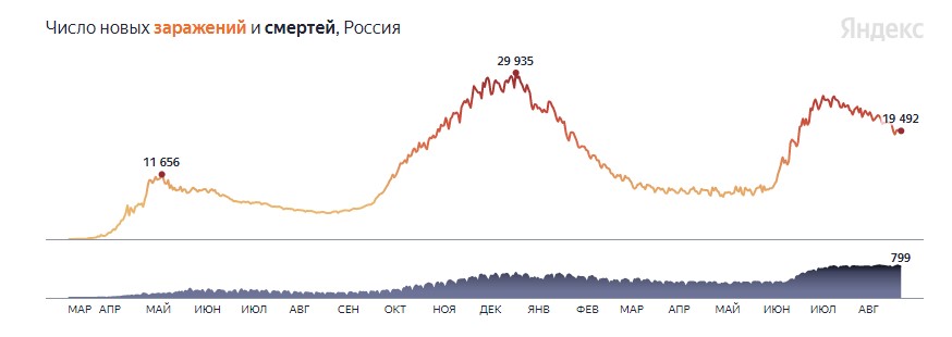 За сутки в России скончались 799 пациентов с COVID-19. Полностью выздоровели 19 411 человек.