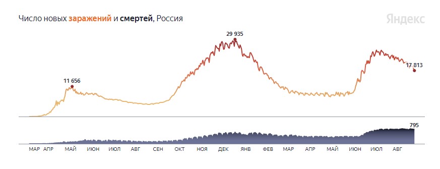 За сутки в России скончались 795 пациентов с тяжёлой формой COVID-19, полностью излечились 18 624 человека.