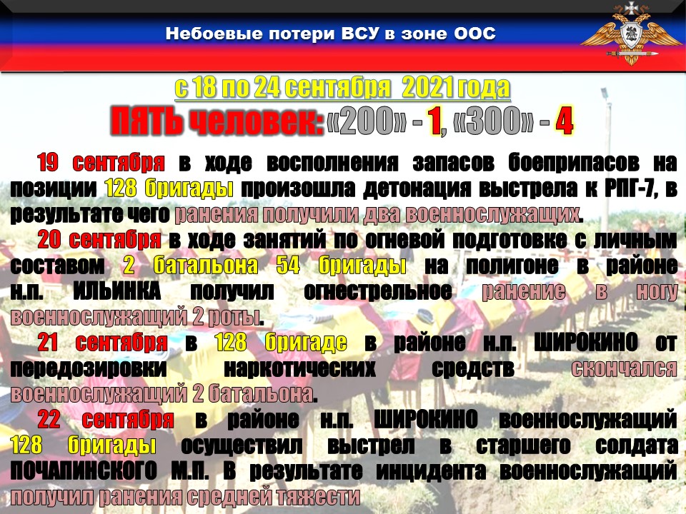 19 сентября в ходе восполнения запасов боеприпасов на позиции 128 бригады произошла детонация выстрела к РПГ-7, в результате чего ранения получили два военнослужащих.