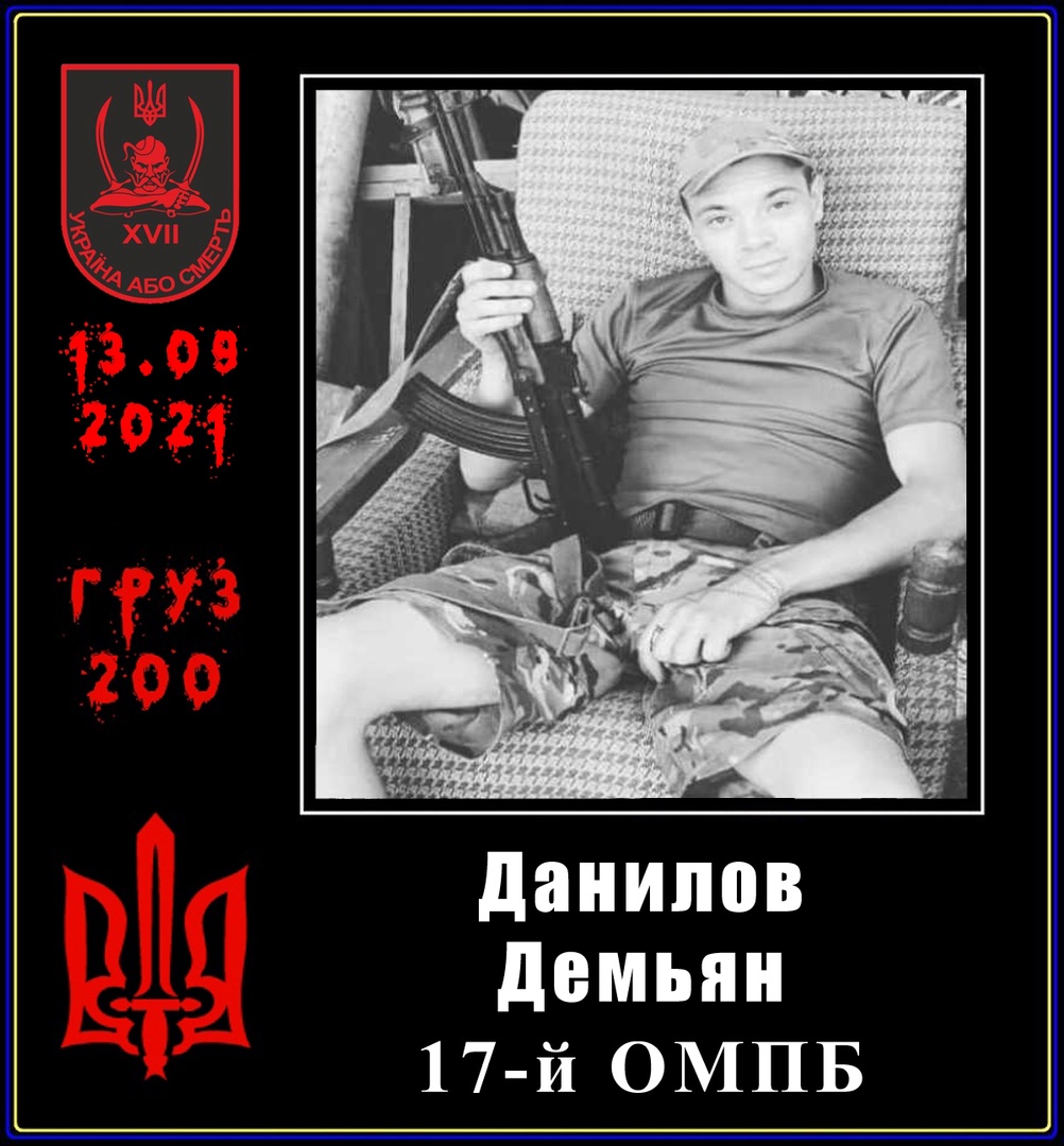 13.09.2021 — Данилов Демьян Петрович, 1997 г. р., старший солдат, командир механизированного отделения 17 ОМПБ «Кировоград» 57 ОМПБр. Свою расплату за жизни невинно убиенных мирных жителей Донбасса получил в виде пулевого ранения в голову (как пишут «захысныки» — пуля была «снайперской»).