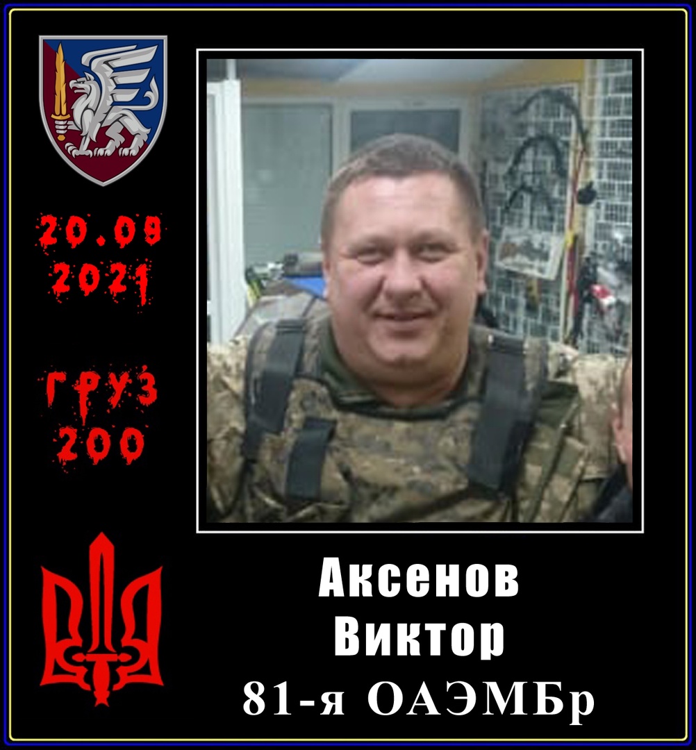 20.09.2021 — Аксенов Виктор, 1972 г. р., старший сержант, военнослужащий 81 ОАЭМБр. Свою расплату за жизни невинно убиенных мирных жителей Донбасса получил в виде смерти от ишемической болезни сердца (инфаркт).