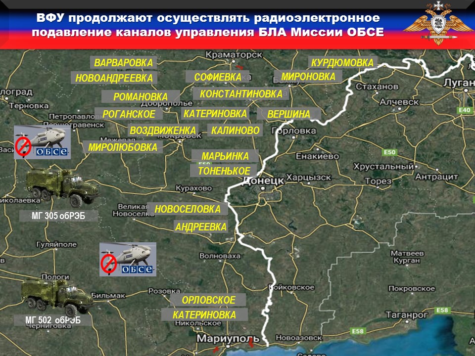 За неделю зафиксировано 19 фактов подавления каналов управления и навигации БпЛА наблюдателей СММ ОБСЕ вдоль линии боевого соприкосновения в районах населенных пунктов: Варваровка, Миролюбовка, Новоандреевка, Андреевка, Курдюмовка, Марьинка, Романовка, Новоселовка, Катериновка, Софиевка, Калиново, Роганское, Константиновка, Орловское, Воздвиженка, Вершина, Калиново, Тоненькое и Мироновка.