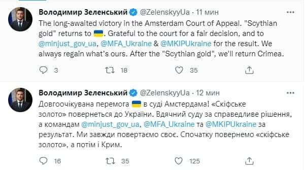 «Долгожданная победа Украины в суде Амстердама. Скифское золото вернется в Украину. Благодарен суду за справедливое решение, а командам Министерства иностранных дел Украины, Министерства юстиции и Министерства культуры и информационной политики за результат.