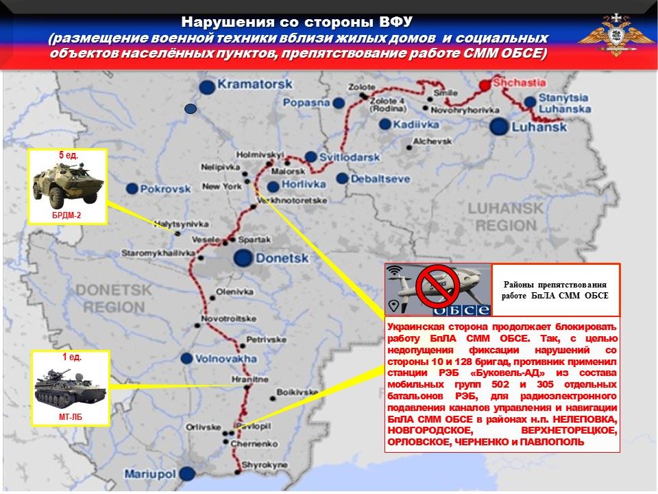 В нарушение третьего пункта Комплекса дополнительных мер, выявлено размещение шести единиц вооружения и военной техники ВСУ вблизи жилых домов и муниципальных объектов на подконтрольной Украине территории.