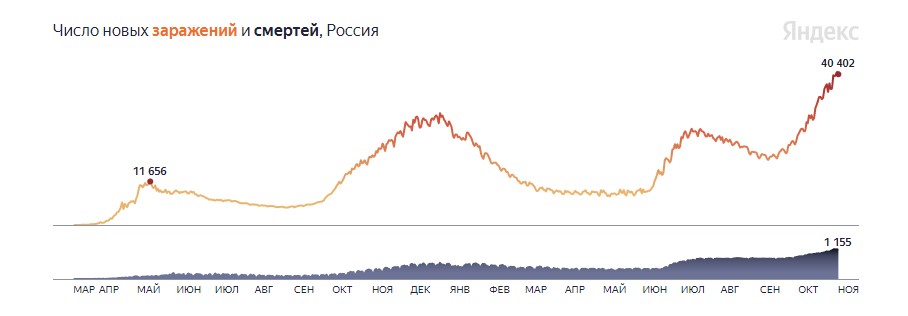 За последние сутки в России выявлено 40 402 новых случая заражения коронавирусом. Общее число заболевших за всё время с начала эпидемии COVID-19 в нашей стране достигло 8 554 192.